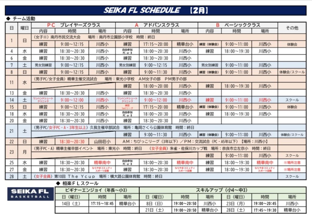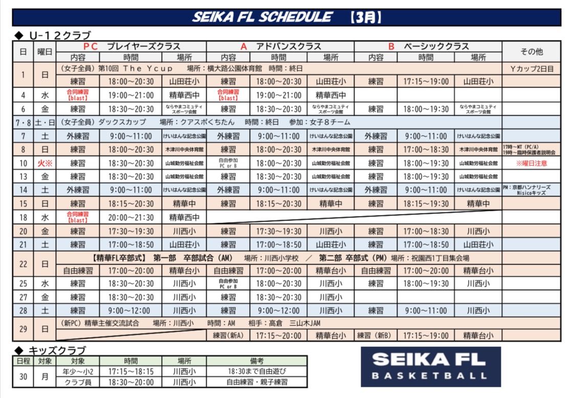 SEIKA FL バスケットボールクラブ ~京都の精華町で活動するクラブチーム~ 【クラブ理念】 安心・安全で、子どもたちがバスケットボールを好きになり、楽しみながら成長できる環境を地域に保証することを理念として活動しています。多くの子どもたちにバスケットボールを体験してもらうため、積極的に普及活動も行っています。 【U12-クラブ】 子どもたちの成長レベルに合わせた3つのクラス分けによる丁寧な指導を行うことで、誰1人取り残すことなく、しっかりと育成することを目指しています。 【キッズクラブ】 幼児を対象としたボール遊び教室(バルシューレ)を行い、まずはボールに触れて楽しんでもらうことをきっかけとして、バスケットボールへの早期導入を目指しています。 5つの育成方針 1. JBA U12指導ガイドラインの遵守2. 成長レベルに合わせた指導体制3. 将来を見据えた指導の徹底4. スポーツ外傷等の予防を徹底5. リスペクト・フェアプレー精神の遵守 BASIC class ベーシッククラス (基礎)最初は楽しくバスケットボール 対 象: 年長~小学2年生(キッズクラブ)小学3~6年生(初心者) 練習日: 水 / 土 / 日 (週3回) 時 間: 平日 18:00~19:30 土日 9:00~11:00 場 所: 川西小学校 精華台小学校 費 用: ¥2,000- /月 ADVANCED class アドバンスクラス (前進)基礎が身に付けば次のステップへ 対 象: 小学3~6年生(中級者) 練習日: (水)/ 金 / 土 / 日 (週3回~) 時 間: 平日 18:30~20:30 土日 9:00~12:00 場 所: 川西小学校 精華台小学校 費 用: ¥2,000- /月 PLAYERS class プレイヤーズクラス (公式戦参加)競技としてのバスケットボール 対 象: 小学4~6年生(中級者・上級者) 練習日: 水 / 金 / 土 / 日 (週4回) 時 間: 平日 18:30~20:30土日 9:00~12:00 場 所: 川西小学校 精華台小学校 費 用: ¥2,000- /月 KIDS club ボール遊び教室(バルシューレ) 「バルシューレ」とは、ボール遊びを通じて運動能力や社会性、自発性などを育むドイツ生まれの教育プログラムです。 リズムトレーニング リズムに合わせて身体を動かし、脳と心を育てる新しい運動遊びです。 対 象: 年少~小学2年生 練習日: 毎週 月曜日 時 間: 17:15~18:15 場 所: 川西小学校 体育館 費 用: ¥2,000- /月 SCHEDULE 最終更新:2月22日 ACCESS 川西小学校 駐車場 体育館西側の駐車場(校外)を使用してください。駐車場は「木津警察署祝園交番」の東側敷地です。【府道22号線から駐車場への進入の目印は歩道橋】 精華台小学校 駐車場 校門から進入して校内の駐車場を使用してください。 STAFF 代表/ヘッドコーチ 山中 徹郎 【主な経歴】 佛教大学体育会バスケットボール部 主将(関西2部)京都実業団バスケットボール選手権大会 優勝(2回)京都実業団バスケットボールリーグ戦 1部 優勝 【現 在】 JBA公認C級コーチ/キッズサポーター バルシューレジャパンC級指導員 社会人チーム 「京都市消防局」監督 全国消防バスケットボール親善大会実行委員会 代表 [大会公式 Instagram↓] Instagram RECRUITING OFFICIAL PARTNER