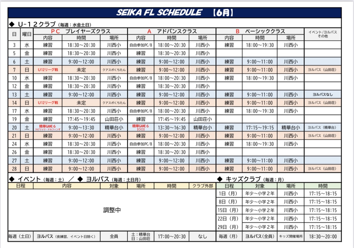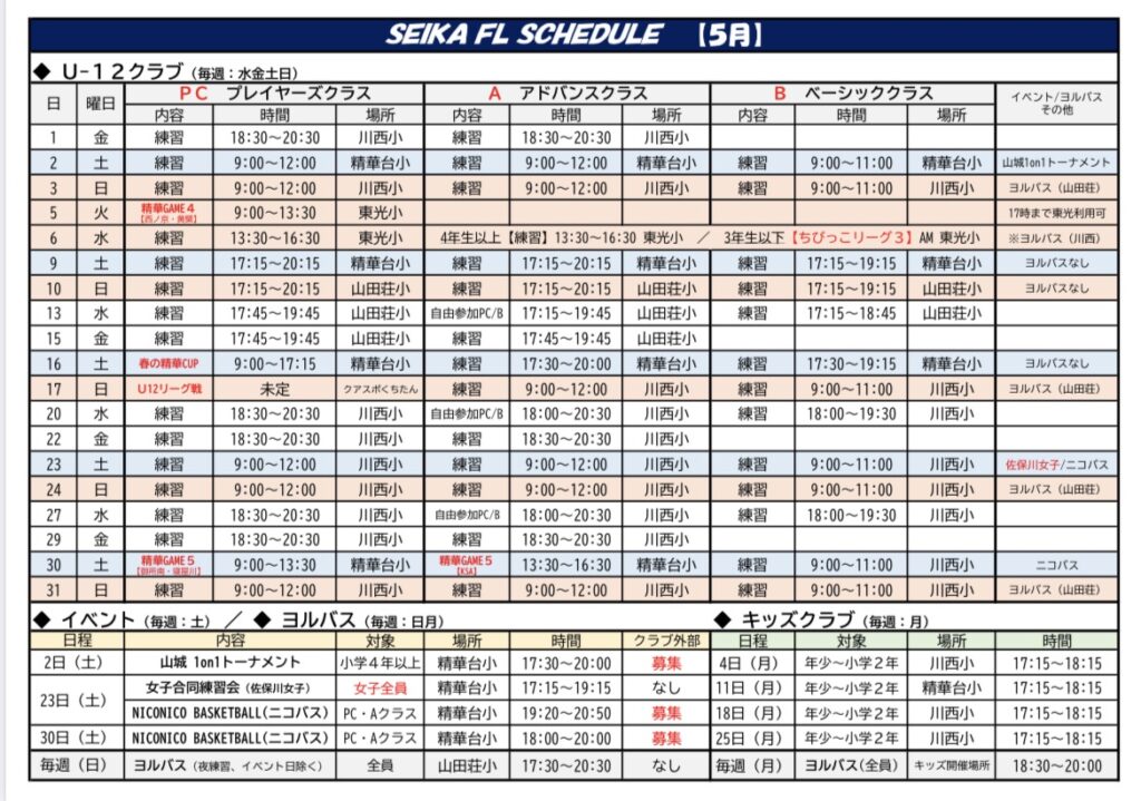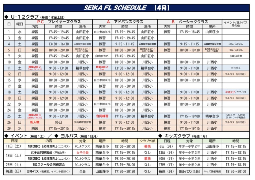 SEIKA FL バスケットボールクラブ ~京都の精華町で活動するクラブチーム~ 【クラブ理念】 安心・安全で、子どもたちがバスケットボールを好きになって、楽しみながら成長できる環境を地域に保証することを理念としています。多くの子どもたちにバスケットボールを体験してもらうため、積極的に普及活動(イベント等)も行っています。 【U12-クラブ】 子どもたちの成長レベルに合わせた3つのクラス分けによる丁寧な指導を行うことで、誰1人取り残すことなく、しっかりと育成することを目指しています。 【キッズクラブ】 幼児を対象としたボール遊び教室(バルシューレ)を行い、まずはボールに触れて楽しんでもらうことをきっかけとして、バスケットボールへの早期導入を目指しています。 5つの育成方針 1. JBA U12指導ガイドラインの遵守2. 成長レベルに合わせた指導体制3. 将来を見据えた指導の徹底4. スポーツ外傷等の予防を徹底5. リスペクト・フェアプレー精神の推進 BASIC class ベーシッククラス (基礎)最初は楽しくバスケットボール 対 象: 年長~小学2年生小学3~6年生(初心者) 練習日: 水 / 土 / 日 (週3回)月 / キッズクラブ(週1回) 時 間: 平日 18:00~19:30 土日 9:00~11:00 場 所: 川西小学校 精華台小学校 費 用: ¥3,000- /月 ADVANCED class アドバンスクラス (前進)基礎が身に付けば次のステップへ 対 象: 小学3~6年生(中級者) 練習日: 水 / 金 / 土 / 日 (週4回) 時 間: 平日 18:30~20:30 土日 9:00~12:00 場 所: 川西小学校 精華台小学校 費 用: ¥3,000- /月 PLAYERS class プレイヤーズクラス (公式戦参加)競技としてのバスケットボール 対 象: 小学4~6年生(中級者・上級者) 練習日: 水 / 金 / 土 / 日 (週4回) 時 間: 平日 18:30~20:30土日 9:00~12:00 場 所: 川西小学校 精華台小学校 費 用: ¥3,000- /月 チーム活動費 /年 KIDS club バルシューレ バルシューレとは、ボール遊びを通じて運動能力や社会性、自発性などを育むドイツ生まれの教育プログラムです。 リズムトレーニング リズムに合わせて身体を動かし、脳と心を育てる新しい運動遊びです。 対 象: 年少~小学2年生 練習日: 毎週 月曜日 時 間: 17:15~18:15 場 所: 川西小学校 精華台小学校 費 用: ¥2,000- /月 ヨルバス 全クラブメンバーを対象にした体育館の開放日です。高学年メンバーは課題等の自主練習、年長、低学年のメンバーは親子でバスケットボールを楽しむことができます。 【開催日程】 ・月曜日: 18:30~20:00 川西小学校 ・土曜日: 17:30~20:30 精華台小学校 ・日曜日: 17:30~20:30 山田荘小学校 SCHEDULE 最終更新:4月9日 ACCESS 川西小学校 体育館西側の駐車場(校外)を使用してください。駐車場は「木津警察署祝園交番」の東側敷地です。【府道22号線から駐車場への進入の目印は歩道橋】 精華台小学校 校門から進入して校内の駐車場を使用してください。 山田荘小学校 校門から進入して校内の駐車場を使用してください。 STAFF 代表/ヘッドコーチ 山中 徹郎 【主な経歴】 佛教大学体育会バスケットボール部 主将(関西2部)京都実業団バスケットボール選手権大会 優勝(2回)京都実業団バスケットボールリーグ戦 1部リーグ優勝 【現 在】 JBA公認C級コーチ/JBA公認キッズサポーター バルシューレジャパンC級指導員 京都市消防局バスケットボール部 監督 全国消防バスケットボール親善大会実行委員会 代表 ▼大会公式 Instagram▼ Instagram コーチ/アシスタントコーチ 11名体制 JBA公認C級、E級コーチJBA公認キッズサポーターバスケットボール専門プロコーチ現役大学生選手コーチ EVENT 各イベントの詳細については、画像をクリックしてください↓ RECRUITING U-12クラブ/キッズクラブ メンバー募集中! 体験・見学のお問い合わせは CONTACT・ インスタグラムDM まで ※SEIKAFLでは、当番、役員等の保護者様のご負担は一切ございません。 OFFICIAL PARTNER