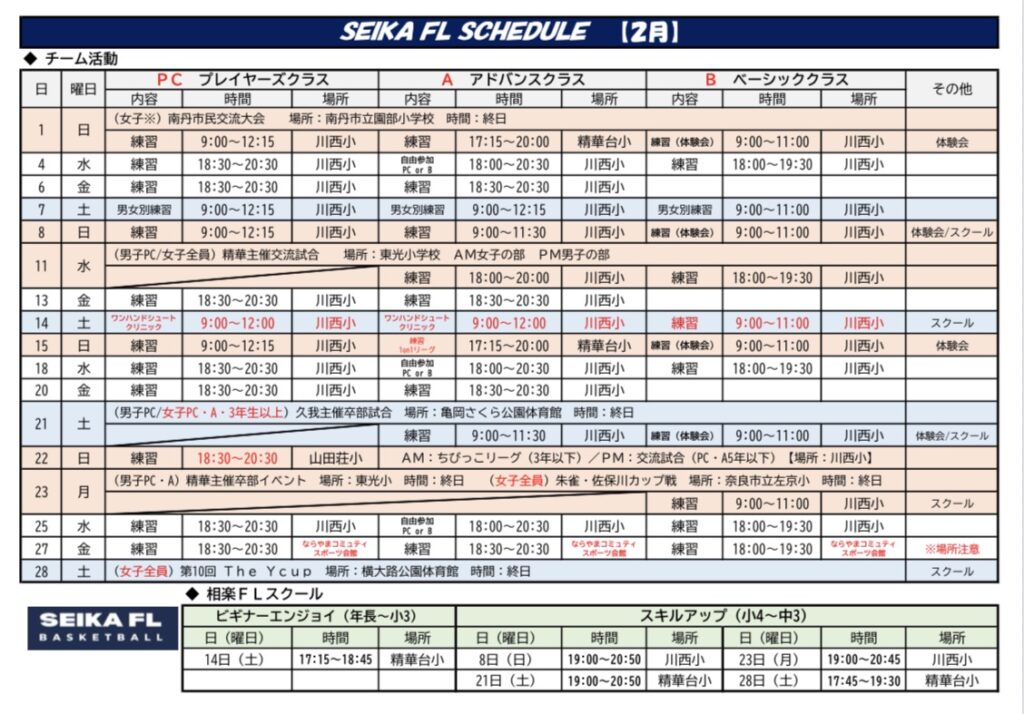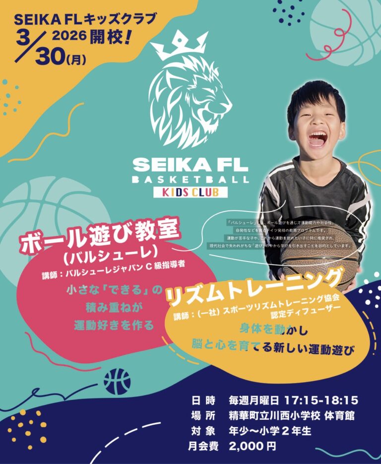 SEIKA FL バスケットボールクラブ ~京都の精華町で活動するクラブチーム~ 【クラブ理念】 安心・安全で、子どもたちがバスケットボールを好きになり、楽しみながら成長できる環境を地域に保証することを理念として活動しています。多くの子どもたちにバスケットボールを体験してもらうため、積極的に普及活動も行っています。 【U12-クラブ】 育成方針の基づいて、子どもたちの成長レベルに合わせた3クラス制による丁寧な指導を行うことで、誰1人取り残すことなく、しっかりと育成することを目指しています。 【キッズクラブ】 幼児を対象としたボール遊び教室(バルシューレ)を行い、まずはボールに触れて楽しんでもらうことをきっかけとして、バスケットボールへの早期導入を目指しています。 5つの育成方針 1. JBA U12指導ガイドラインの遵守2. 成長レベルに合わせた指導体制3. 将来を見据えた指導の徹底4. スポーツ外傷等の予防を徹底5. リスペクト・フェアプレー精神の遵守 BASIC class ベーシッククラス (基礎)最初は楽しくバスケットボール 対 象: 年長~小学2年生(キッズクラブ)小学3~6年生(初心者) 練習日: 水 / 土 / 日 (週3回) 時 間: 平日 18:00~19:30 土日 9:00~11:00 場 所: 川西小学校 精華台小学校 費 用: ¥2,000- /月 ADVANCED class アドバンスクラス (前進)基礎が身に付けば次のステップへ 対 象: 小学3~6年生(中級者) 練習日: (水)/ 金 / 土 / 日 (週3回~) 時 間: 平日 18:30~20:30 土日 9:00~12:00 場 所: 川西小学校 精華台小学校 費 用: ¥2,000- /月 PLAYERS class プレイヤーズクラス (公式戦参加)競技としてのバスケットボール 対 象: 小学4~6年生(中級者・上級者) 練習日: 水 / 金 / 土 / 日 (週4回) 時 間: 平日 18:30~20:30土日 9:00~12:00 場 所: 川西小学校 精華台小学校 費 用: ¥2,000- /月 KIDS club ボール遊び教室(バルシューレ) 「バルシューレ」とは、ボール遊びを通じて運動能力や社会性、自発性などを育むドイツ生まれの教育プログラムです。 リズムトレーニング リズムに合わせて身体を動かし、脳と心を育てる新しい運動遊びです。 対 象: 年少~小学2年生 練習日: 毎週 月曜日 時 間: 17:15~18:15 場 所: 川西小学校 体育館 費 用: ¥2,000- /月 SCHEDULE 最終更新:2月8日 ACCESS 川西小学校 駐車場 体育館西側の駐車場(校外)を使用してください。駐車場は「木津警察署祝園交番」の東側敷地です。【府道22号線から駐車場への進入の目印は歩道橋】 精華台小学校 駐車場 校門から進入して校内の駐車場を使用してください。 STAFF ヘッドコーチ 山中 徹郎 【主な経歴】 佛教大学体育会バスケットボール部 主将(関西2部)京都実業団バスケットボール選手権大会 優勝(2回)京都実業団バスケットボールリーグ戦 1部 優勝 【現 在】 JBA公認C級コーチ JBA公認キッズサポーター 社会人チーム 「京都市消防局」監督 全国消防バスケットボール親善大会実行委員会 代表 [大会公式 Instagram↓] Instagram RECRUITING OFFICIAL PARTNER
